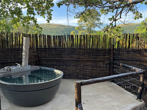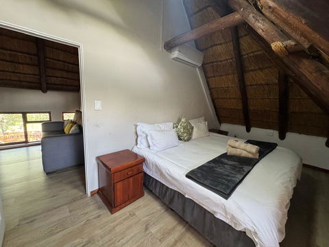 Mbekka Lodge is a cozy, well-equipped retreat located in the heart of Mabalingwe. It features two airconditioned bedrooms accommodating up to four to 4 guests, along with a sleeper couch more suitable for a child. The bedrooms are upstairs, so guests will need to climb stairs to access them. The lodge boasts a wood-fired Kol Kol hot tub in a private garden, complete with braai facilities and outdoor seating. Guests can also opt to hire a game drive vehicle or book guided game drives with experienced rangers for an additional fee.